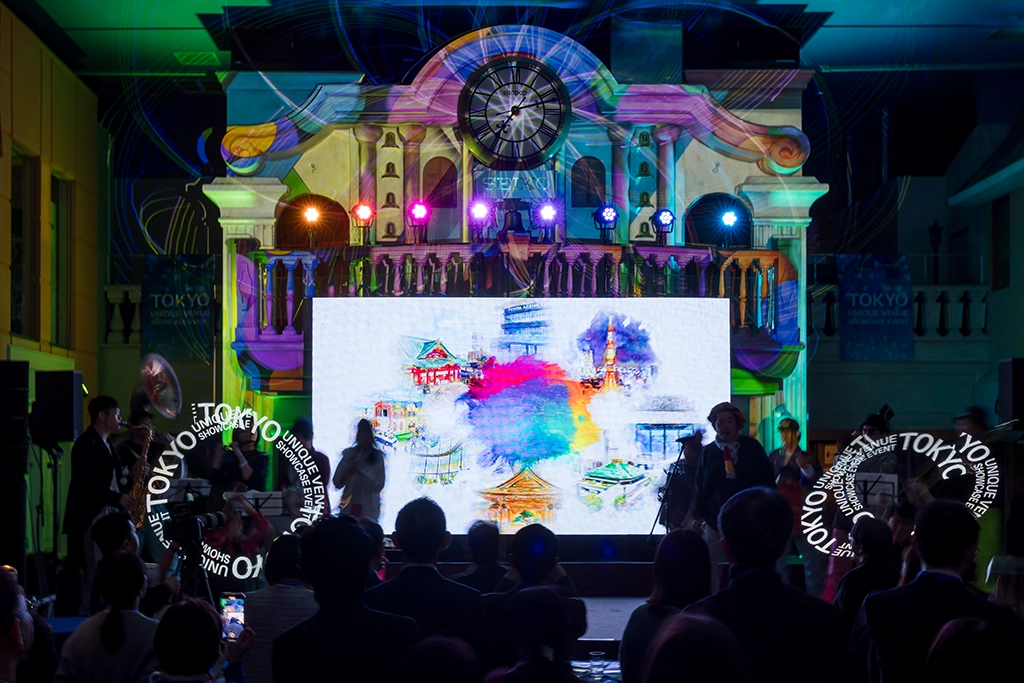 「キッザニア東京」の営業終了から3時間で機材搬入、設営、リハーサルをして、開場を行いました。ウェルカムドリンクの提供や生演奏で参加者を迎え、大道芸のパフォーマンスにより参加者を中央広場のステージへと誘導しました。 ステージに設置したLEDパネルには、色鮮やかなオープニング映像、天井には花火、街並みにもカラフルな照明を投影し、映像・照明・音楽の組み合わせにより施設内全体をさらに華やかにしました。