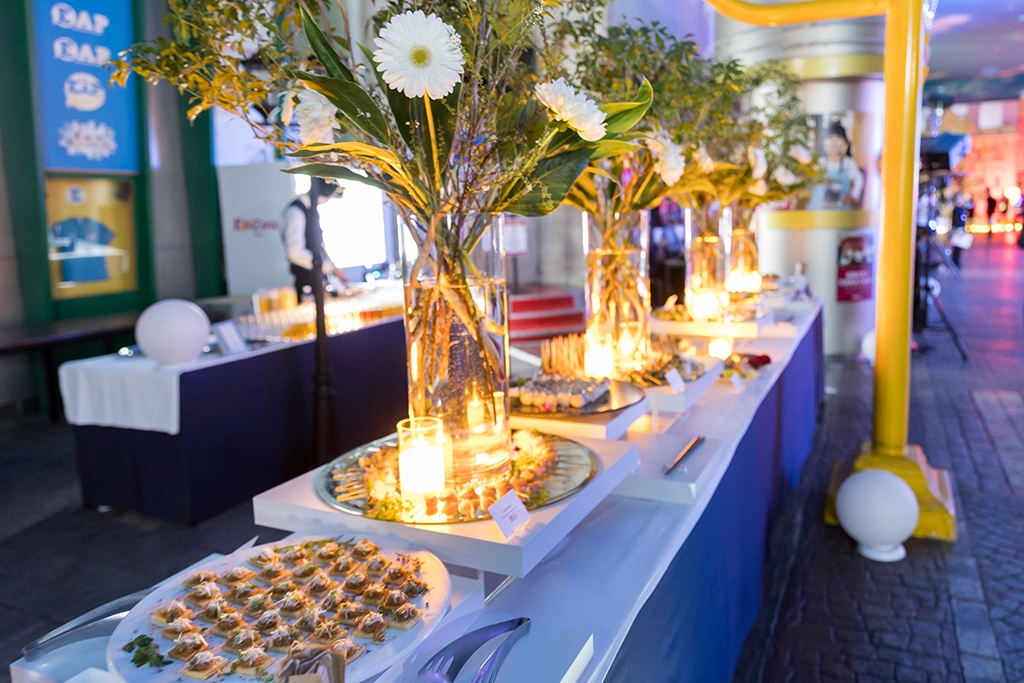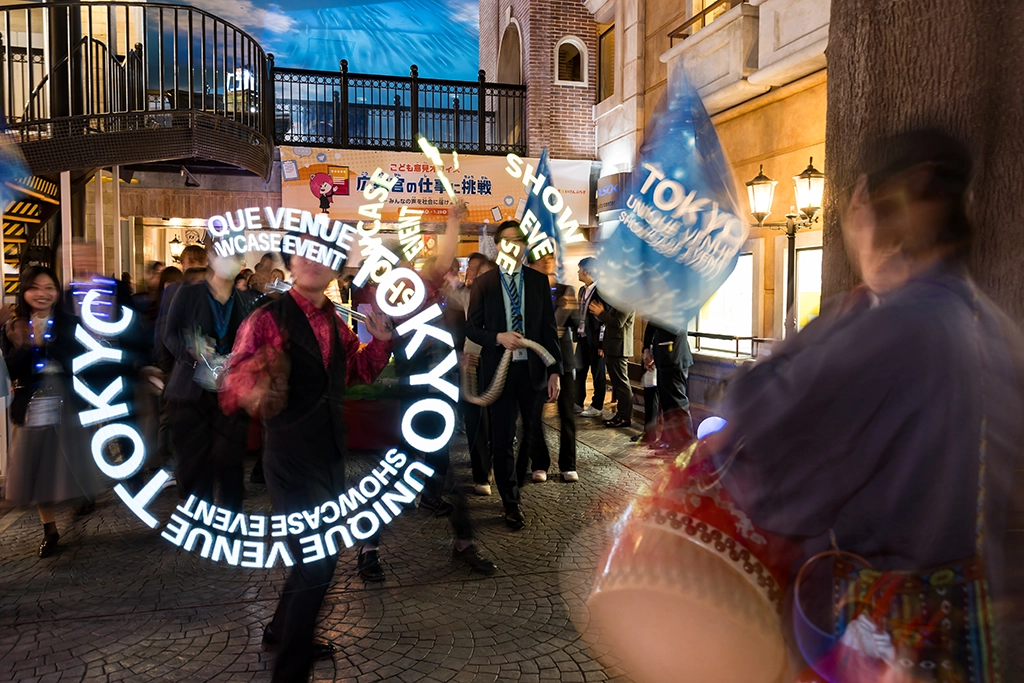 オープニングの後は、パビリオンでの仕事を体験できるキッザニア東京ならではのプログラムをお楽しみいただきました。また、東京産の食材を活かした料理、八丈島や奥多摩で作られた飲物など東京を感じられる飲食も提供しました。 同僚として仕事をした参加者の間には自然な交流が生まれ、お食事とともにネットワーキングが活発に行われました。 イベントの終盤は、光るネックストラップやユニークベニューフラッグを参加者が身に着け、七色に輝くユニークベニュー山車を曳きながら施設を全員でパレードし、最後はステージでの楽団と大道芸人によるフィナーレパフォーマンスで終了しました。