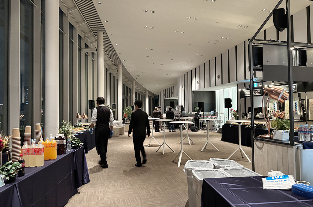 本編終了後は展望ラウンジで懇親会が開催されました。お台場の美しい夜景を背景にバンドの生演奏が実施され、華やかな空間で参加者同士の交流が深まりました。