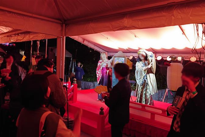 福徳の森では、ステージでの太神楽、花魁道中、獅子舞やクイズを交えた紙芝居等、日本橋のイメージとマッチする和文化のエンターテインメントとともに、本格的な懐石料理や日本酒も振る舞われました。また、当日は好天に恵まれましたが、ショーケースイベントならではの試みとして雨天時を想定したテントも設置され、屋外空間ならではの課題への対応が検証されました。